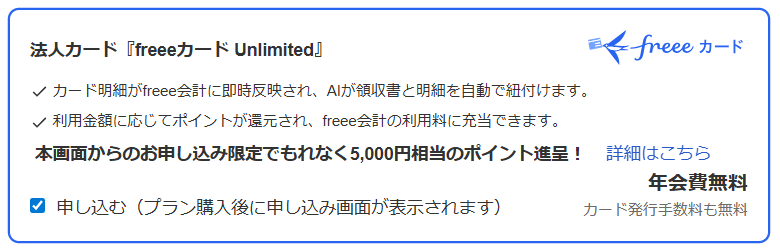 プランを購入するときに、法人カード『freeeカード Unlimited』を申し込むことで、5,000円相当のポイントをゲットすることができます。