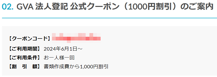 GVA法人登記トップページ ⇒事例・コラム ⇒法人登記コラム ⇒「割引クーポンをお探しの方へ」の記事で公式クーポンが配布されていますので、ご確認ください。
