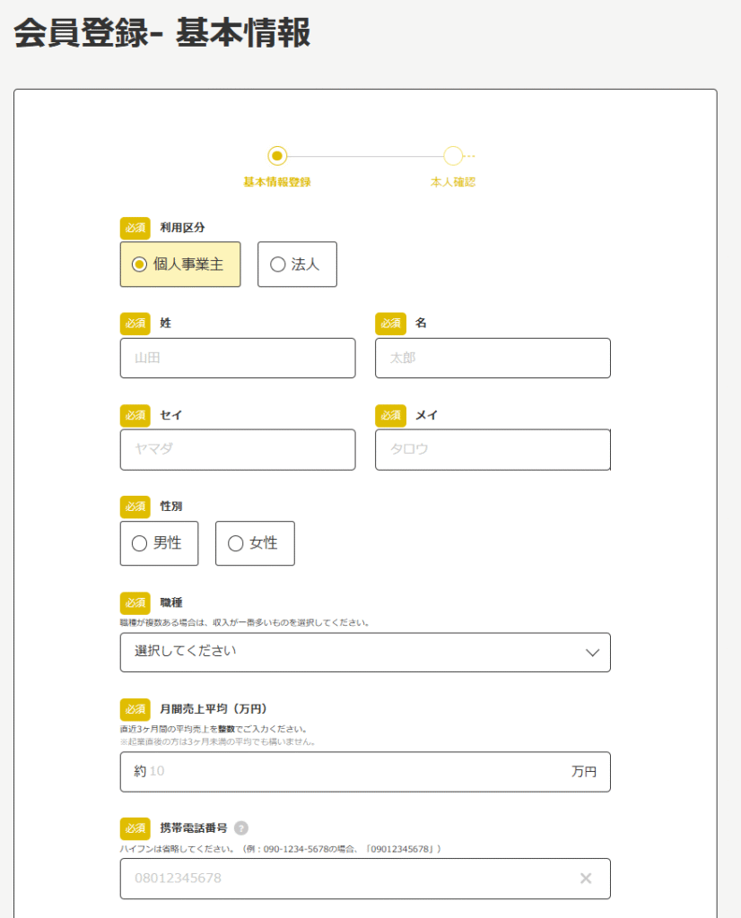 届いたメールから会員登録に進んで、氏名や職種、月間売上などを入力し、