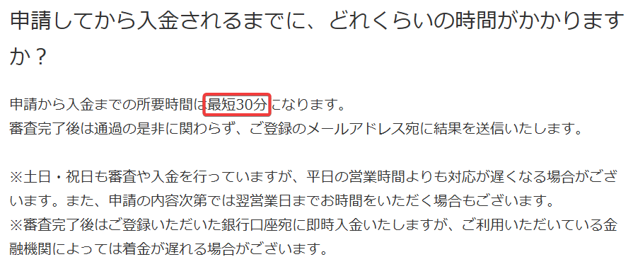 また、この「請求書買取申請」から実際の「入金」までは、最短30分であると公表されています。(以下はlabolの「よくある質問」より。)